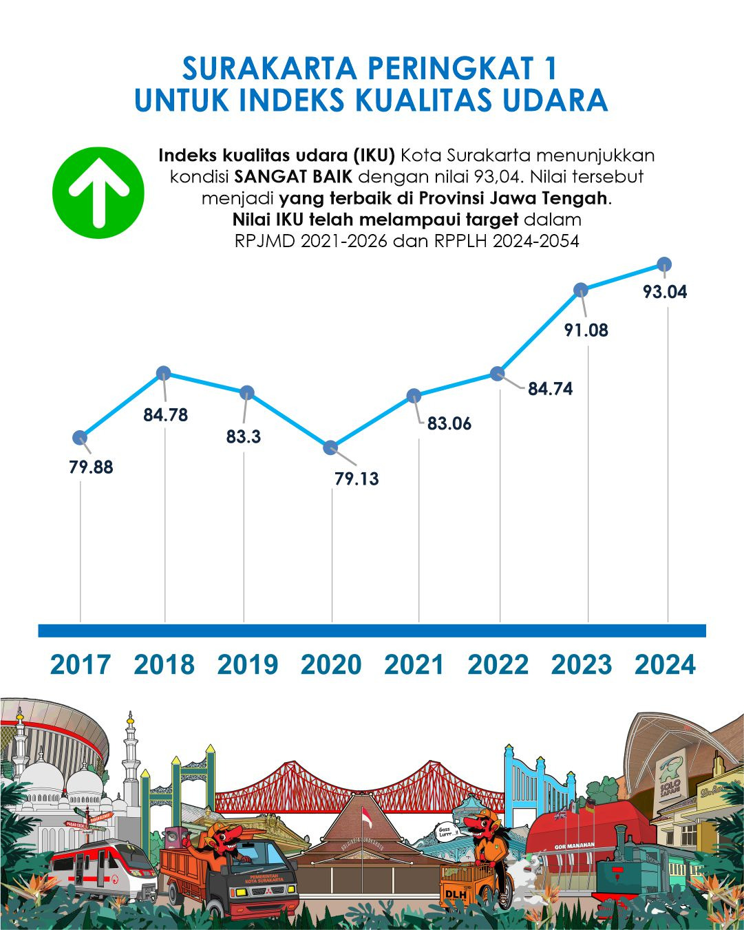 10:39:22 WIBDeskripsi : Indeks Kualitas Udara (IKU) Kota Surakarta menunjukkan kondisi SANGAT BAIK dengan nilai 93,04. Nilai tersebut menjadi yang terbaik di Provinsi Jawa tengah. Nilai IKU telah melampaui target dalam RPJMD 2021-2026 dan RPPLH 2024-2054.
